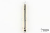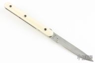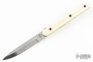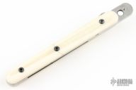 This knife by Francis Boyd features a mirror polished blade with thumbdisc. The handle has mammoth scales over stainless steel liners and backspacer. Includes a padded zippered case.  One of the scales is cracked.  Has some light scratches otherwise the knife is in good condition.