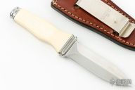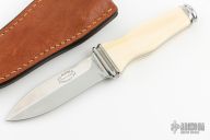 This is a very attractive boot knife from AG Russell. This knife features a mirror polished dagger style blade with a full tang construction.  .158" Blade Stock.  .903" blade Depth.  The handle has mammoth ivory scales. Includes a brown leather sheath. Has dings, scuffs and scratches otherwise the knife is in good condition.