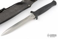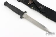 This Guardian II by Gerber features a double edged satin finished blade, .240" blade stock and .938" blade depth, hidden tang construction. The handle is black coated cast aluminum. Comes with a black leather sheath, original box and papers. Excellent condition. #A5049S