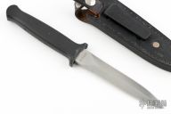 This Guardian I by Gerber features a double edged satin finished blade, .162" blade stock and .826" blade depth, hidden tang construction. The handle is black aluminum. Serial # C0741S. Excellent condition. Comes with original black leather sheath.