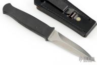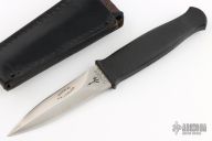This Gerber Guardian is an R.W. Loveless design and features a satin finish double edged blade with .160" blade stock and .790" blade depth, hidden tang construction. Black aluminum textured handle with "Guardian" stamped on side. Knife includes a black leather sheath. #B6556S on the blade. Has a couple light scratches, excellent condition otherwise.