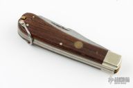 This 666 Puma Gelder from Puma Knives features a clip point blade with nail nick. The handle has nickel silver bolsters, wood covers over brass liners and steel backspring.  Made in late 70s early 80s. Rust is visible and the tip of one of the blades is missing.  Has scuffs/scratches otherwise the knife is in fair condition for its age.