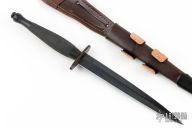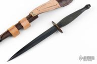 This Fairbairn Sykes Fighting Knife by HG Long & Co features a black double edged blade with .155" blade stock and .858" blade depth, hidden tang construction with black steel handle and fittings. Comes with a brown leather sheath, original box and papers. Excellent condition.