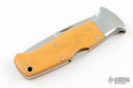 This SERE folder from Al Mar Knives features a satin finish drop point blade with false top edge and nail nick. Satin finish bolsters, paper micarta scales over brass liners. Opens and closes with a nice snap. Comes with original nylon sheath. Has some scratches and patina, otherwise fair condition.