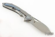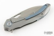 This model of the Bestech ESKRA comes with a gray titanium handle with blue hardware. The blade sports a stonewash finish and is made from Bohler M390.