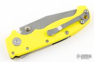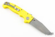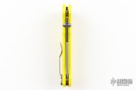 This AD20S by Andrew Demko features a stonewashed drop point blade with notched thumbrest and dual thumbstuds.   The handle has a yellow Grivory frame with a tip up stainless steel clip and "Shark" lock release on the spine. Comes with original box. Excellent condition.