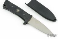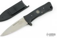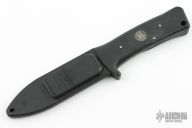 This knife is a Blackie Collins Design. Features a satin finished drop point blade with .170" blade stock and 1.092" blade depth, hidden tang construction with black FRN handle. Comes with original sheath. Has been resharpened.  Has some light scratches and oxidation spots, otherwise good condition.
