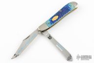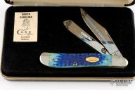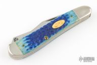 This knife features 2 polished blades with nail nicks. The handle has nickel silver bolsters, blue jigged bone covers, with a Case shield, brass liners and stainless springs. Comes with a display box. #046. Excellent condition.