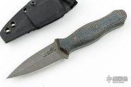 This Combat Dagger by Half Face Blades features an acid etched and rock-washed double-edged blade with a full tang construction.  .152"Blade Stock.  .997"Blade Depth.  The handle has kamari brulap micarta scales.  Includes a black kydex sheath.  Excellent Condition.