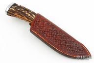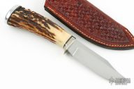 This hunter by Kelly S Kennedy features a satin finished blade with .178" blade stock and 1.159" blade depth, hidden tang construction. The handle has a nickel silver guard, aluminum butt, stag grip with black spacers. Comes with a hand tooled brown leather sheath. Has some scratches, otherwise good condition. Dated 2002