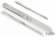 They are hand made from stainless steel. Has a pinch locking type mechanism. Separate the handle with your fingers to close.
