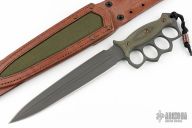 Embodying history and our own design philosophies, Lady Death is our rendition of the classic trench knife. We decided to go big, like no other, with a 15" overall length, and 9 5/8" CPM-Magnacut double-edge dagger blade with a long fuller down the middle. The knuckle duster style handle acts as a guard to protect your hands, and the aggressive outward shape works well for raking. To round out the overall shape, the end of the handle features a pronounced pomel for hammer-striking. The handle is finished with Dirty Olive G10 handle slabs with a checkered texture that is suitable in dry or wet conditions. The handle slabs are attached with Grade 5 Titanium fasteners that are electro-anodized in bronze to round out the look. Lady Death includes a brown leather sheath with a contrasting green canvas inlay. The sheath is ambidextrous, and can be worn on a belt or attached to PALS webbing.