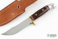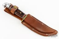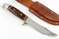 This knife by Western Cutlery features a mirror finished blade with .110" blade stock and .990" blade depth, full tang construction. The handle has a brass guard, dymondwood scales, black/red/white spacers and an aluminum butt. Comes with a brown leather sheath. Has some light scratches, has some oxidation spots, otherwise good condition.