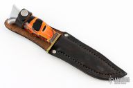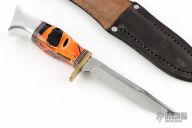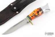 This knife by Western Cutlery features a mirror finished blade with .095" blade stock and .783" blade depth, hidden tang construction. The handle has a brass guard, acrylic grip with black/aluminum/red spacers and an aluminum butt. Comes with a black leather sheath. Has some light scratches and patina, otherwise good condition.