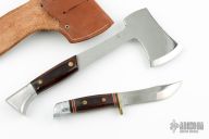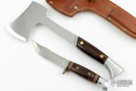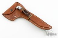 This vintage Hatchet/Hunter set by Western features an upswept blade and a hatchet. The handles have aluminum guards, dymondwood scales and an aluminum pommel. Has some light scratches and patina, otherwise good condition. Comes with original sheath that holds both.