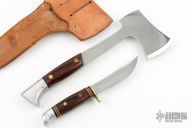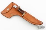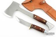 This vintage Hatchet/Hunter set by Western features an upswept blade and a hatchet. The handles have aluminum guards, dymondwood scales and an aluminum pommel. Has some light scratches and patina, otherwise good condition. Comes with original sheath that holds both.