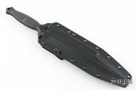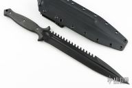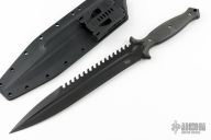 This Razorback prototype #001 from Knife Makers Guild member Todd Begg features a black blade with sawteeth on the spine and fullers, .279" blade stock and 1.470" blade depth, full tang construction. Bohler N690 steel with double row sawteeth that transitions to a sharpened top edge near the tip. Textured carbon fiber handles. Comes with a kydex sheath. This beast of a knife is in excellent condition and shows no signs of use or carry. The rear of the blade is marked "Prototype 001". Comes in a padded/zippered case.
