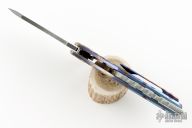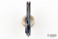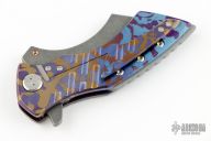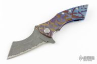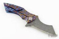 This Model XR3 framelock flipper from Sergey Rogovets features a dark tumble finished clip point sheepsfoot blade with flipper and simulated hamon at the edge. The handle has an orange peel finished and anodized titanium frame with a matching pocket clip, tip up carry, floating Damascus backspacer. Blade is centered when closed and opens smoothly. Locks up with no play, has a D2 lockface insert. Knife is in excellent condition. #1603, comes with a zippered case.