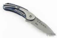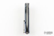 This Bodega Beggatti by Todd Begg Knives has a tumble finished multi-ground spear point blade with notched thumbrest, fullers and flipper, 1/4" blade stock. Has Ceramic IKBS. The handle has 3/16" thick anodized and milled titanium scales with a titanium lockbar and tip up clip, 1/4" thick titanium backspacer with crosshatch jimping. Has nice detent, lockup and blade seating. Very smooth action. Excellent condition. Comes with nylon zippered case.
