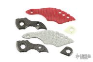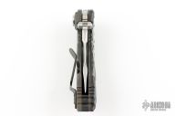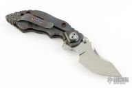 This Mini Hard-1 frame lock flipper by Yuna Knives features a "Flame" finished and bead blasted titanium frame and tip up clip, carbon fiber overtravel stop, black G-10 backspacer. Has a carbon fiber front scales. Comes with two other sets of front scales. Satin finished blade with dual thumb studs and a notched thumbrest and flipper. Rides on bearings, nice detent, blade seating and lockup. Comes with a zippered case. Has a few light scuffs, otherwise excellent condition.