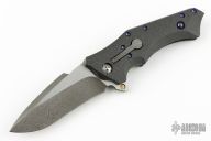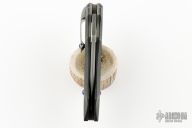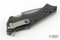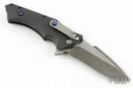 This Necromonger by Allen Elishewitz features a Damascus blade with false top edge and gold medallion in flipper tab. The handle has a carbon fiber frame with Damascus rocker bar and backspacer, anodized titanium handle screws. Tip down titanium clip with roller ball. Nice detent, lockup and blade seating. Excellent condition.