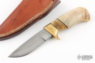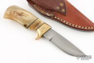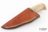 This Pronghorn by Ed Fowler features a drop point blade with convex ground bevels and visible temper line, .261" blade stock and 1.163" blade depth, hidden tang construction. The handle has an engraved brass guard, sheep horn grip with sheep horn and black spacers. Comes with a brown leather left handed sheath. Excellent condition.