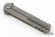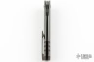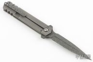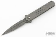 This Drench flipper by Shannon Carter features a Damascus double edged blade with fullers and a flipper. The handle has a tumbled titanium frame with hole pattern, zirconium pivot collars, floating Damascus backspacer and tip up clip. Nice detent, lockup and blade seating. Rides on bearings. Comes with zippered case. Knife is in excellent condition and shows no signs of use/carry. This was Shannon Carter's first ever auction piece.