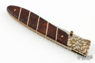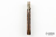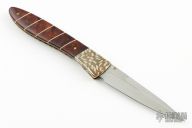 This linerlock folder by Don Maxwell features a mirror polished blade with false top edge, and single thumbstud with orange stone inset. The handle has dovetailed bolsters, ironwood scales with wire inlays, fileworked and anodized titanium liners with jeweled interiors, fileworked and anodized titanium backspacer. Nice detent, blade seating and lockup. Comes with a velcro belt sheath. Excellent condition.