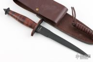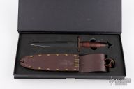 An important piece of equipment of the Devil's Brigade was the specially designed V-42 combat knife, which was also part of the intensive close combat training. The handle of compressed leather discs ends in a pointed impact cap. A thick leather padding underneath the slightly curved pommel offered protection from injury. The double-edged blade of the dagger features a corrugated thumb rest for a secure grip. To this day, the crest of the Special Forces of the U.S. Army adorns this legendary dagger. We not only deliver this exclusive collector's item with its classic leather sheath, but also with a replica of the cloth insignia of the unit, which is the red spearhead, and with a reproduction of the original German sticker with the words "The worst is yet to come!", which was stuck behind enemy lines in order to demoralize the enemy. A premium collector's ensemble, especially ideal for aficionados of military history!