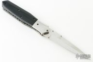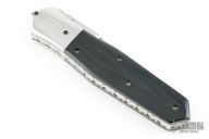 This D/A auto by Nate Clark features a mirror polished spear point blade with fileworked spine and a single black G-10 inlaid thumbstud with knurling. The handle has black G-10 scales, polished bolsters, polished titanium liners with jeweled interiors, fileworked stainless steel backspacer. Nice action, lockup, detent and blade seating. Has some light scuffs and scratches, great condition otherwise.