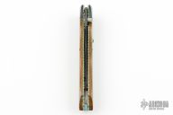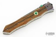 This Royal Dagger D/A Auto by Nate Clark features a spear point Damascus blade with false top edge and single knurled thumbstud with green jewel inlay. The handle has Damascus bolsters, mammoth ivory scales, anodized and fileworked titanium liners, and a fileworked stainless steel backspacer. Green jewel inlay on the push button as well. Nice detent, lockup and blade seating. Comes with a zipper case. Excellent condition.
