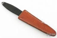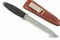 This EK knives Pig Sticker features a bead blast finish surgical stainless steel double edge blade, .147" blade stock and .908" blade depth. Black cord wrapped handle. Full tang construction. Nice classic feeling knife. Comes with a brown leather sheath, some of the stitches are cut. has some scuffs, otherwise good condition.