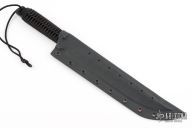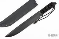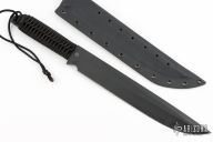 This Short Combat Sword from Mick Strider features a black coated blade with a nice deep swedge. The blade stock is .302" with a blade depth of 1.718". This beast has a cord wrapped handle and a black kydex sheath. Has some scuffs and scratches, has been used, otherwise good condition.