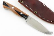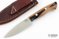 This Mini Aurora by Bark River Knives features a satin finished blade with .141" blade stock and .966" blade depth, full tang construction. The handle has Black Texas Fencepost scales. Comes with a brown leather sheath and original box. Excellent condition.