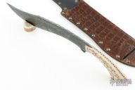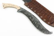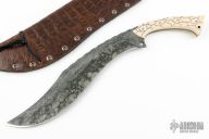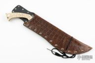 This Bokri by Sage Blades features a black and silver KG-Gunkote (marble/Damascus pattern) blade with fileworked spine, .188" blade stock and 2.555" blade depth, full tang construction. The handle has ivory paper micarta scales, textured and patterned, with nickel silver pins and a black lanyard with ivory micarta bead. Comes with a brown leather sheath with crocodile patterned overlay. Excellent condition.