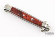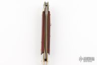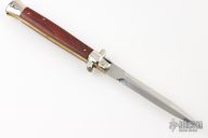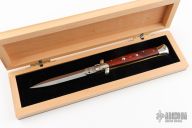 This swivel bolster auto by Latama features a dagger blade with a false top edge. Nickle silver guard and rear bolster and rosewood scales, brass liners and stainless steel backspacer. Nice function, strong firing and lock up. Excellent condition. Comes with a wooden presentation box.