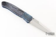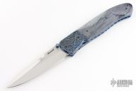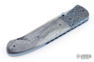 This linerlock folder by Don Maxwell features a mirror polish finished spear point blade with blue stone inlaid thumbstud. Dovetailed Damascus bolsters and dyed giraffe bone scales over anodized titanium liners and backspacer with jeweled interiors. Nice detent, lockup and blade seating. Comes with a cloth pouch. Has a couple light scuffs, otherwise excellent condition.