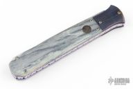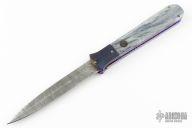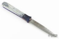 This Icepick side-opening automatic by Rainy Vallotton features a Damascus blade with false top edge. The handle has blued Damascus bolsters, giraffe bone scales, matching Damascus push button. File work on stainless steel backspacer and all around the anodized titanium liners. Strong and fast leaf spring action. Comes with original box.