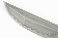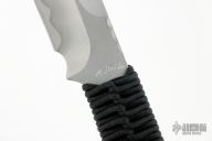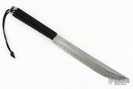 This sword by Mick Strider features a multi-ground blade with hamon and false top edge, file-work on the blade spine, .306" blade stock and 1.596" blade depth, hidden tang construction. The handle has paracord wrap with extended cord lanyard. Comes with a velcro case. Excellent condition.