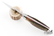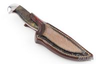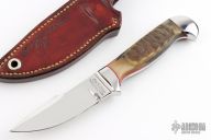 This Modified Hunter by Jerry E Johnson features a mirror polished blade with false top edge, .200" blade stock and 1.089" blade depth, full tapered tang construction. The handle has mirror polished 416 stainless steel dovetailed bolsters, sheep horn scales with red liners. Comes with a brown leather sheath with hippo hide overlay. One of the scales is loose, otherwise excellent condition. Comes with COA dated April 27, 2010, and #0710 on tang.