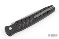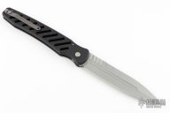 This XL Bones automatic from Rob Dalton has a bead blast blade with false top edge, and black slotted aluminum frame. Bead blast titanium clip. Strong and fast coil-spring opening. Includes zippered case. Has some light scuffs and scratches, great condition otherwise.