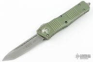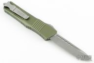 This Combat Troodon by Microtech features an Apocalyptic finished tanto blade. The handle has an OD Green aluminum frame with apocalyptic finished hardware and tip down clip. Comes with original box and papers. Dated 02/2021 and s/n 32460. Has been resharpened, has some minor wear on the edges of the frame, otherwise good condition.
