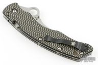 This C146CFP Szabo Folder from Spyderco features a satin finish clip point blade with swedge and thumb hole. The handle is comprised of gold line carbon fiber/G10 laminate scales over steel liners and barrel spacers. Black coated 4 way adjustable pocket clip. Lanyard tube in pommel. Excellent condition. Comes with a zippered case.