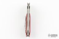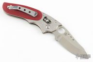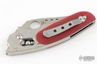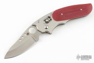 This Phoenix by Spyderco is a Howard Viele Design. The blade is satin finished with thumbhole opening. The handle has a titanium frame with red G-10 scales, stainless steel backspacer, and a tip up stainless steel clip. Excellent condition. Comes with original box and papers. Still has plastic covers on the bolsters.