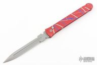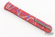 This Splash Assassin by Rob Dalton features a double-edged bead blast finish blade and a splash anodized aluminum frame. Bead blast titanium clip, tip up carry. Powerful coil spring action. Comes with a zipper case. Has a couple light scuffs otherwise excellent condition.