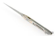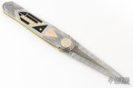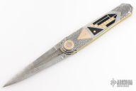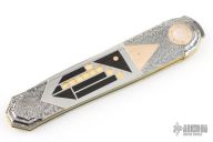 This Art Deco Linerlock Folder by Owen Wood features a multi-bar Damascus blade with false top edge, .105" blade thickness. The handle has Damascus bolsters, gold pivot with black lip pearl inlay, two-tone gold inlays on bolsters, mirror polished stainless steel scales with gold spacers, inlays, anodized titanium liners, two-tone blued steel backspacer. The handle is .440" thick at the widest part and 1.148" tall at the pivot area. Comes with a zippered case. Has some light scuffs and scratches, otherwise excellent condition.