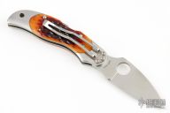 This lock back folding knife by Spyderco features a satin finish VG10 blade, and stainless steel double bolsters. Nice jigged bone scales. Stainless steel clip. Includes original box and papers. Excellent condition.