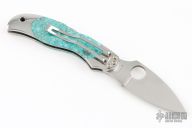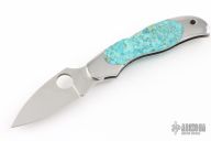 This lock back folding knife by Spyderco features a satin finish VG10 blade, and stainless steel double bolsters. Nice turquoise scales. Stainless steel clip. Includes original box and papers. Excellent condition.