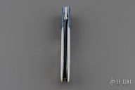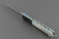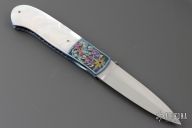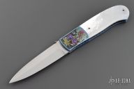 This liner lock folder from Jay Harris features a hand rub satin finish blade with false top edge and titanium thumb disc. The handle is comprised of engraved and anodized titanium bolsters and pearl scales over anodized and jeweled titanium liners and fileworked titanium backspacer. Great blade seating and lock up. Has a couple very light scratches, excellent condition otherwise.