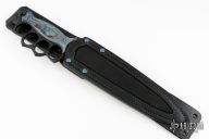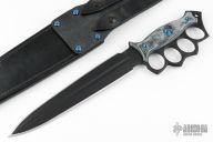 Embodying history and our own design philosophies, Lady Death is our rendition of the classic trench knife. We decided to go big, like no other, with a 15" overall length, and 9 5/8" CPM-Magnacut double-edge dagger blade with a long fuller down the middle. The knuckle duster style handle acts as a guard to protect your hands, and the aggressive outward shape works well for raking. To round out the overall shape, the end of the handle features a pronounced pomel for hammer-striking. The handle is finished with Dirty Olive G10 handle slabs with a checkered texture that is suitable in dry or wet conditions. The handle slabs are attached with Grade 5 Titanium fasteners that are electro-anodized in bronze to round out the look. Lady Death includes a brown leather sheath with a contrasting green canvas inlay. The sheath is ambidextrous, and can be worn on a belt or attached to PALS webbing.